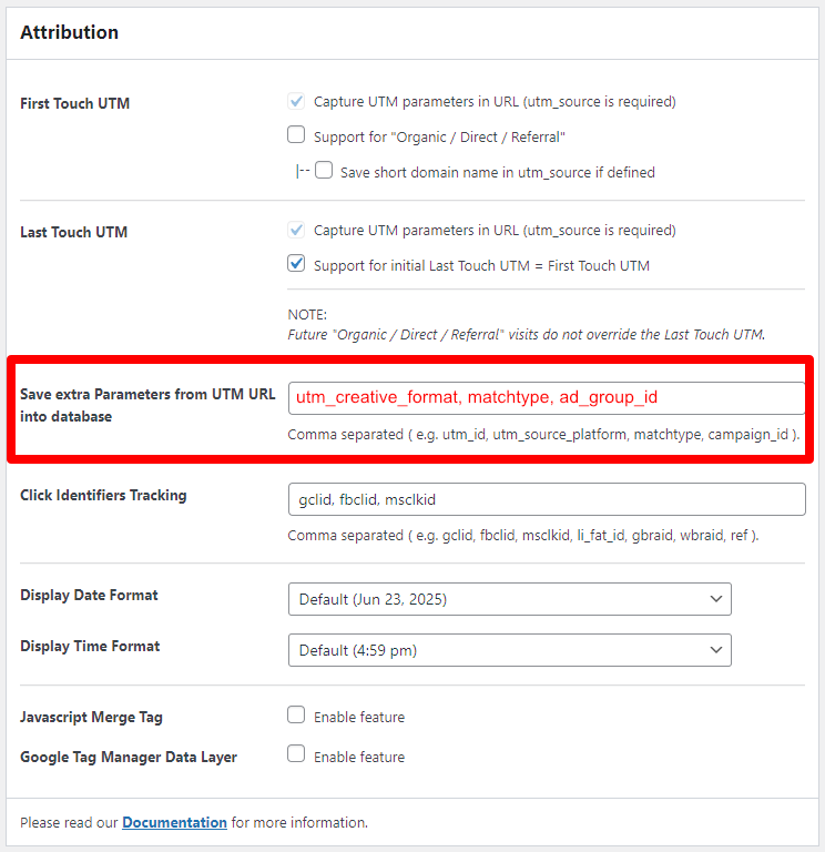 - “Save Extra Parameters from UTM URL into the database” setting field.